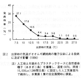 - 本病の種子伝染による発病は出芽時の気温が低いほど多くなり、とくに15℃より低い温度ではこの傾向が顕著である(図2)。