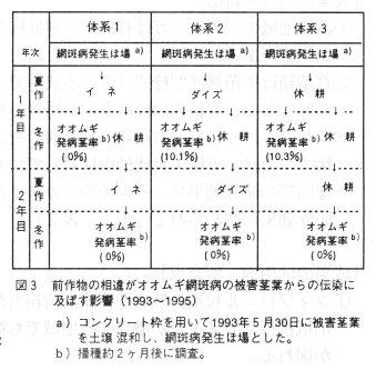 - 本病が発生したほ場では被害茎葉からの伝染が起こるが、これを防止するための耕種的防除法として、麦跡にイネを作付するか、または次年度のオオムギの作付を中止する方法が有効である(図3)。