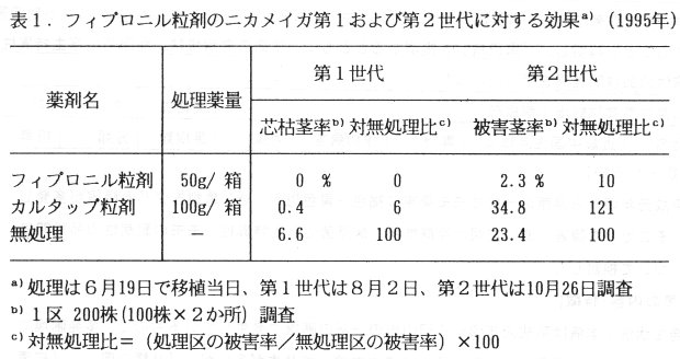- フィプロニル粒剤を育苗箱当たり50g を3日前又は移植当日に処理すると、全ての試験でニカメイガ第1世代幼虫に対して、カルタップ粒剤の育苗箱当たり100g処理とほぼ同等の防除効果で、その後のニカメイガ第2世代幼虫による被害に対しても優れた防除効果が認められる(表1、表2)。