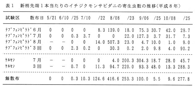 - ケルセン乳剤1,500倍液の7月散布及び6月、7月、8月の3回散布ともにイチジクモンサビダニに対する密度抑制効果と被害軽減効果は低い(表1、表2)。