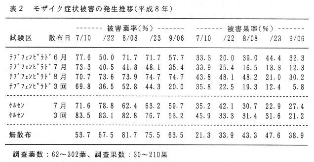- イチジクモンサビダニによって引き起こされるモザイク症状の被害葉率及び被害果率はテブフェンピラド水和剤2,000倍液の6月散布及び8月散布では無散布とほぼ同等で被害軽減効果は低いが、7月散布では3回散布とほぼ同等の高い被害軽減効果が認められる(表2)。