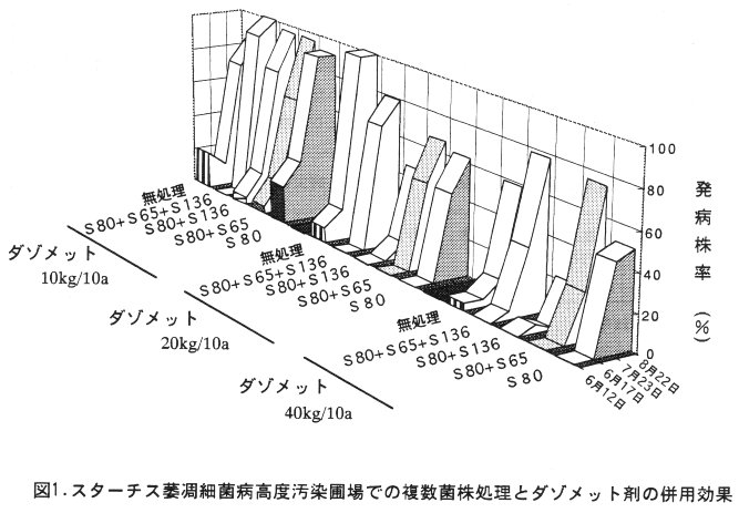 - 圃場試験において、複数菌株の処理により発病抑制効果の増強と効果の持続が認められ、S80とS136菌株の組み合わせで効果が高い(図1)。