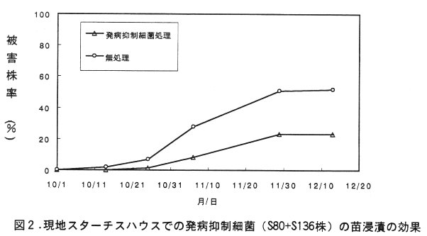 - 農家ハウスの9月6日定植のスターチス栽培において、土壌消毒をしない条件で実施した、発病抑制細菌処理(S80、S136菌株混合)は萎凋細菌病による被害に対し軽減効果が高く、現地適応性が認められる(図2)。
