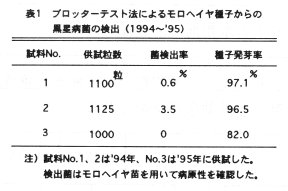 - ブロッターテスト法を用いて、1992~'95年の栽培に使用されたモロヘイヤ種子から黒星病菌の検出を試みた結果、'92~ '94年に使用された種子の最高で3.5%から本病菌が検出された(表1)。