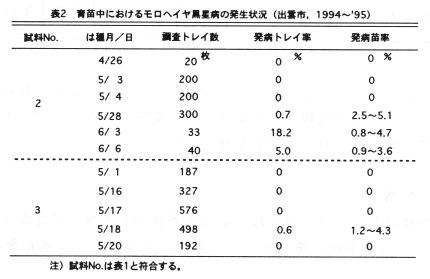 - 1994、 '95年、プラグトレイを用いた育苗中に子葉や下位葉で発病が認められ、発病トレイの割合は0.6~18.2%、各トレイ当たりの発病苗率は0.8~5.1%であった(表2)。