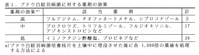 - 殺菌剤46種を供試して、ブドウ白紋羽病菌培養枝片を土壌中に埋没させた後に薬液を処理する方法で、有効薬剤の選抜を行った結果、フルアジナム水和剤の効果が高かった(表1)。