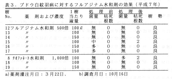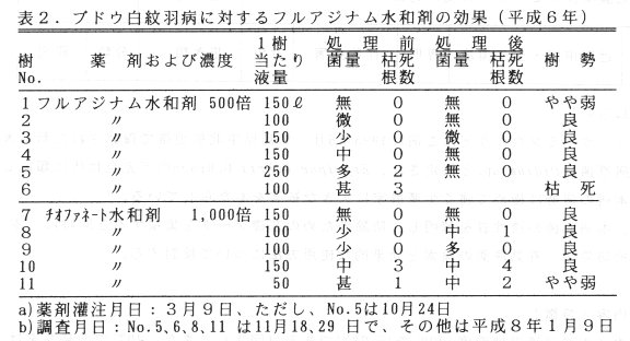 - ブドウ白紋羽病発病樹に対して、平成6年春にフルアジナム水和剤 500倍液を処理した結果、6樹のうち甚発生であった1樹は枯死したが、5樹はほとんど再発せず、対照薬剤のチオファネ-トメチル水和剤 1,000倍液に勝る防除効果が認められた(表2)。