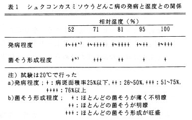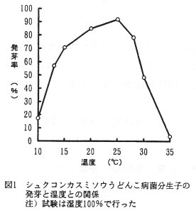 - 本菌分生子の発芽適温は湿度は100%で15-28℃である(図1)。また、20℃での発芽率は、湿度100%で最も高く、湿度71-95%の範囲で差がない。一方、接種後の好適発病条件は、20℃、湿度約70-80%である(表1)。