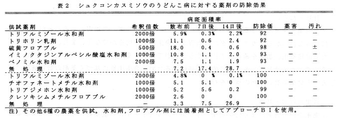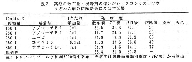 - 数種のDMI剤、硫黄フロアブル剤、ベンズイミダゾール系殺菌剤などが、本病に対し高い防除効果を有する(表2)。また、湿展作用の強い展着剤を添加し、十分な量の薬液を散布することで効果的に防除できる(表3)。