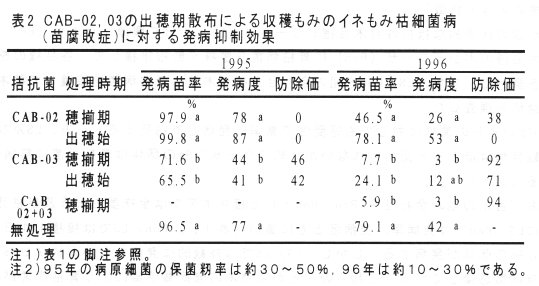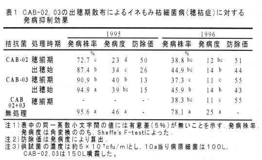 - 1995~96年、イネ(品種:金南風)の出穂始に病原菌を接種し、その直後及び穂揃期にCAB-02(Pseudomonas sp.)、03 (Pseudomonas gladioli ) を処理した。穂枯症が甚発生した95年にはCAB-02の穂揃期処理が防除価50を、少発生の96年には穂揃期のCAB-02、03ともに50以上の防除価を示した。また、CAB-02と03の混合処理も同様の効果が認められた(表1)。