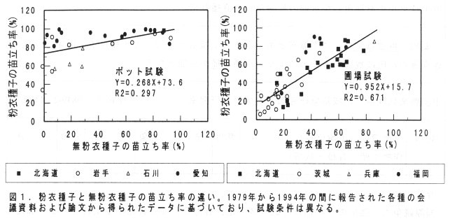 - 日本国内各地で、粉衣種子と無粉衣種子を使って試験された過去のデータを解析したところ、ポット試験では粉衣の効果は顕著に現れているが、圃場試験では、粉衣による苗立ちの改善効果は平均16%にすぎないことが判明した(図1)。このことは粉衣の効果が、条件により異なり過大評価されていること及び無粉衣土中播種においては、播種量を上げることにより粉衣に相当する効果が期待できることを示唆している。