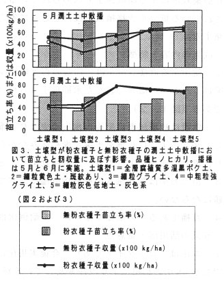 - 各種の土壌型を持つ水田ライシメーターで、粉衣種子と無粉衣種子の潤土土中散播での苗立ちを比較したところ、細粒灰色低地土で安定した高い苗立ち率が得られた(図3)。無粉衣による苗立ち率の低下は平均14%であり、収量の低下は3%であった。