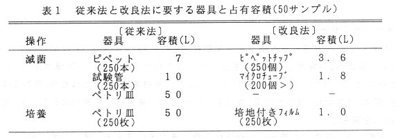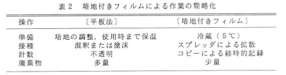 - 培地付きフィルム(3M社製、商品名ペトリフィルム)を使用することで、滅菌作業を省略でき、培養時の省スペース化が図れる(表1)とともに、培地調整・接種・計数・廃棄作業の簡略化が可能である(表2)。なお、本法と従来法の相関については、以下の文献に示されている。