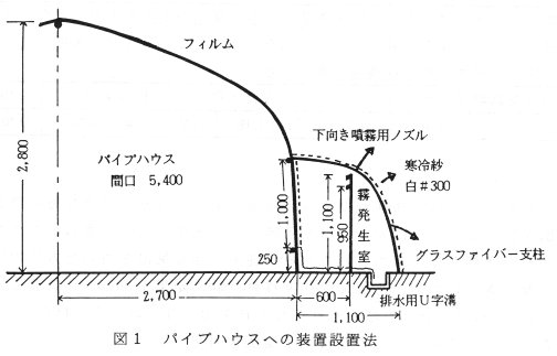 - パイプハウスの側壁部に、寒冷紗で覆った人工霧を発生する小部屋を設け、2m間隔に細霧冷房用ノズル(ホルテックⅢ型、10気圧で作動)を2段に配置する。大粒の霧は寒冷紗で取り除かれ、ボタ落ちなどの落下水はマルチで排水溝から排出される(図1)。この結果、ハウスの換気扇による空気の流れに乗って、空中浮遊性の霧だけが室内に導入され、土壌水分の上昇を避けることができる。
