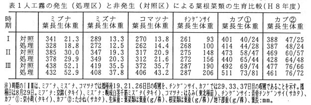 - 本装置を用いて、人工霧を発生させた場合(処理区)とさせない場合(対照区)の葉根菜類の生育反応を調査した。霧の発生は必ずしも生育を抑制せず、生育を促進する場合もある(表1)。
