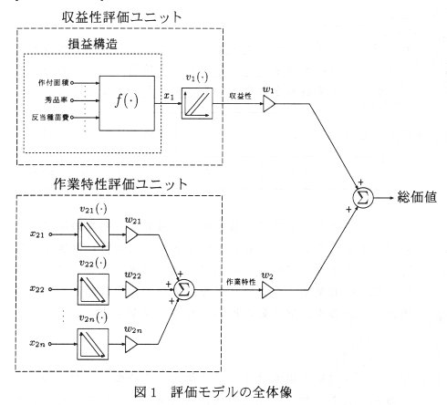 υ(χ) = ω1 υ1 (χ1 ) + ω2 υ2 (χ2 ) を作成した(図1)。υ1 (χ1 ) が収益性を、υ2 (χ2 ) =Σni =1 ω2 i υ2 i (χ2 i ) が作業特性を示す。χ1 は純収益、χ2 i は各作業項目の作業時間、ω1 、ω2 、ω2 i はウェイトである。