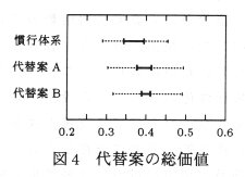 - 無間引栽培・収穫機導入によるダイコン作新技術体系(表1)の事前評価の結果を例示する。作業項目に対するウェイトは農家が作業の改善を望む度合を表している(図2)。代替案は、収益性と作業特性を軸とする平面上で比較できる(図3)。右上の方向に位置するほど望ましい代替案である。収益性をみると、代替案A、代替案Bの中心位置は慣行体系とほぼ同じであるが、その幅(バラツキ)は慣行体系より大きい。作業特性では、代替案Bは慣行体系を完全に優越している(重複部分がない)。さらに、収益性の中心位置と作業特性の区間から求められる総価値の小区間(実線)で比較すると、代替案A、Bは慣行体系を完全には優越しない(弱い意味で優越する)ことがわかる(図4)。以上のように本手法は不完全な情報下において技術体系を事前に評価する上で有効である。