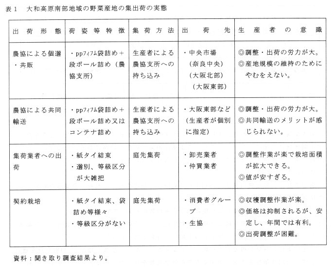 - 本県中山間野菜産地である大和高原南部地域のホウレンソウを中心とした野菜の流通実態を調査し、農協系統外の多様な出荷組織が庭先集荷と包装の簡便化によって生産者を引きつけていること、農協としては、パート労働または包装機を導入した共選場の設立が必要であることを明らかにした。