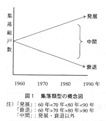 - 1960年から90年の間存続した集落を対象にして、その総戸数の増減によって、各集落を「発展」、「中間」、「衰退」の3類型に分類した(図1)。