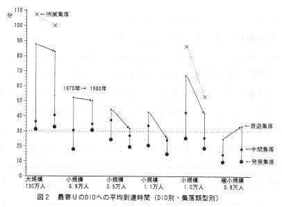 - DIDに関する変数は③からは抽出されなかったが、それは各DIDの規模格差による。つまり、最寄りDIDが大規模の衰退集落の平均到達時間は約90分であるのに対し、極小規模DIDは30分を切る(図2)。また、DIDまでの平均到達時間は縮小傾向にある。