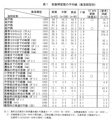 - 定住条件とみなし得る説明変数として集落カードから30変数を抽出し、判別分析を適用して、上記3類型を予測判別する上で有効な変数を探った(表1)。その結果、「総戸数(90年)」、「総戸数(60年)」、「小学校までの距離(80年)」の3変数が有効であった(正判別率72.6%)。戸数規模と共に小学校距離が有効なのは、交通弱者(transportaion poor)、ここでは毎日通学する児童の徒歩限界が定住を左右するからである。