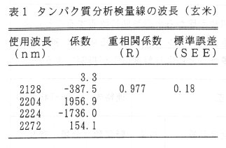- 酒米の玄米、白米ともタンパク質含量の化学分析値はケルダール窒素蒸留法で測定した値である。また、白米は搗精率が70%条件としている。スペクトルデータは白米及び玄米の粉末(0.5mmメッシュ)をBRAN+LUEBBE社のInfrAlyzer500型で測定した。