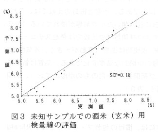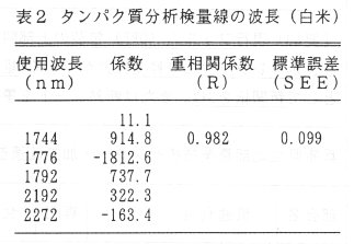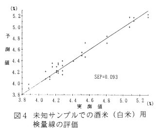 - 酒米の白米測定検量線は「山田錦」、「兵庫夢錦」他60品種・1系統を検量線作成用として47点、検量線評価用として17点を用いた。サンプルのタンパク質含量の範囲は3.6%~5.3%である。検量線は原スペクトルを用い1744、1776、1792、2192、2272nmの5波長 、重相関係数 R=0.98、SEE=0.099である(表2、図2)。