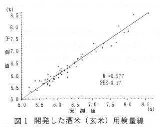 - 酒米の玄米測定検量線の作成には「山田錦」、「兵庫北錦」他64品種・16系統を検量線作成用として60点、検量線評価用として20点を用いた。サンプルのタンパク質含量の範囲は5.5%~8.5%である。検量線は原スペクトルを用い2128、2204、2224、2272nmの4波長で、重相関係数 R=0.977、SEE(標準誤差)=0.17である(表1、図1)。