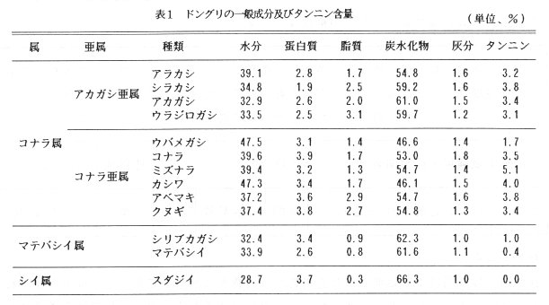 - 鳥取県内および近傍のドングリ13種類について一般成分とタンニン含量を調査した。蛋白質はコナラ属のアカガシ亜属よりコナラ亜属の方が若干多い傾向である。脂質および灰分はマテバシイ属やシイ属で少ない傾向である。タンニン含量は、そのまま食すことも可能なシイではみられず、アクが少ないとされているマテバシイ、シリブカガシ、ウバメガシなどでは2 %以下で最も多いものはミズナラであった(表1)。