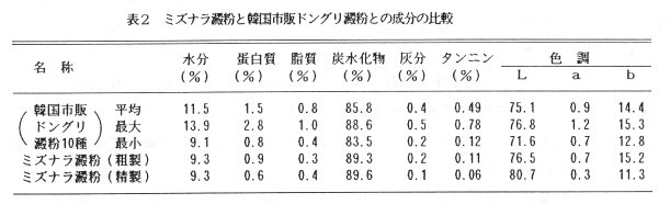 - 最もアクが多く、かつ、多量に採集可能なミズナラについて、水浸漬、磨砕、ロ過布で澱粉を含んだ液を漉し、静置し粗澱粉を沈澱させ、水さらしを3 回繰り返してアク抜きをした精製澱粉は炭水化物以外の成分が良く取り除かれ、タンニンが少なく、色調が明るくて韓国市販ドングリ澱粉と比べて同等以上の品質が得られた(表2)。