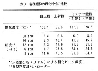 - このミズナラ澱粉の糊化特性について、示差熱分析法による糊化温度と粘度について検討した。精製したミズナラ澱粉は粗製のものに比べて糊化温度が低くなり、糊化ピーク温度は78.5℃であった。8 %澱粉を含む溶液を撹拌加熱して90℃以上に達してから10分間保持した後、80℃で粘度を測定したところミズナラ澱粉糊は極めて大きな粘度を示した(表3)。