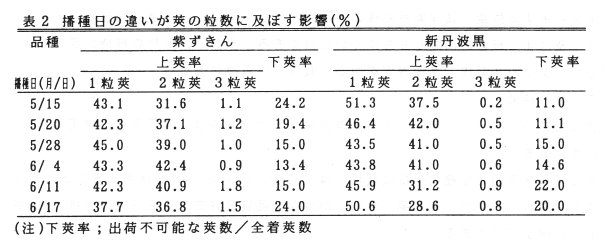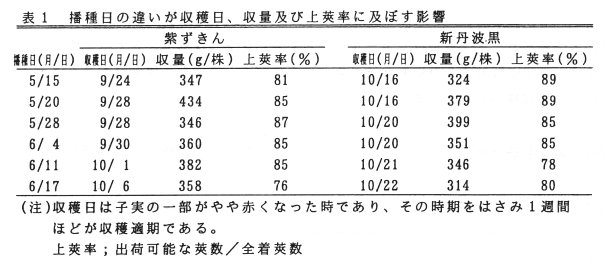 - 6月上旬の播種では、「新丹波黒」は10月中旬から、「紫ずきん」はこれより20日程度早くから収穫でき、10月上旬頃までが収穫時期となる(表1)。
