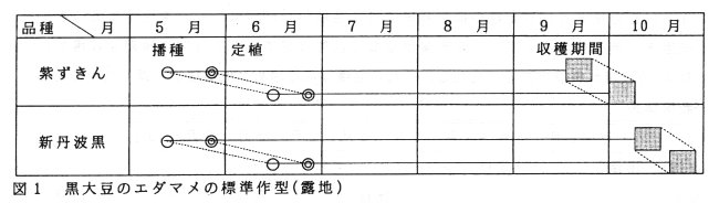 - これらのことから、「紫ずきん」と「新丹波黒」の栽培を組み合わせることにより、良質の黒大豆のエダマメが9月下旬から10月下旬まで連続出荷できる(図1)。