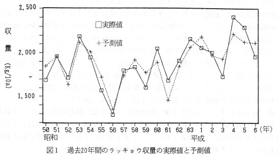 - 鳥取県岩美郡福部村で生産されるラッキョウを対象に、過去20年間の気象観測値と農協出荷データを用いて収量予測式を作成した。予測式は1月の日最高気温、11月、12月の月間降水量を用いるため、出荷の数カ月前から予測が可能である。