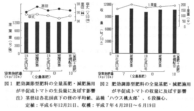 - ‘ハウス桃太郎’を用いた半促成栽培(6段摘心)では、被覆尿素(120日タイプ)を全量基肥施用すれば、有機配合肥料(基肥+追肥の窒素10kg/10a)を施用する場合に比べ、2~3割減肥(窒素7~8kg/10a)しても成長量に差はなく、同等の収量が得られる(図1、図2)。