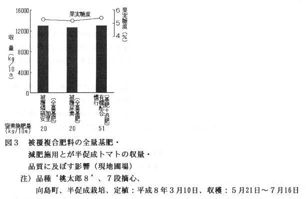 - 慣行として有機配合肥料(基肥+追肥の窒素24+27=51kg/10a)を施用している広島県内産地の圃場(‘桃太郎8’、半促成栽培、7段摘心)では、被覆燐硝安加里(100日タイプ)又は被覆尿素(120日タイプ)全量基肥施用すると、窒素20kg/10aとしても収量・品質は慣行と同等で、施肥量が節減できる(図3)。