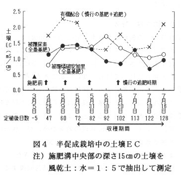 - 半促成栽培で温度依存型の肥効調節型肥料を全量基肥施用(窒素20kg/10a)とすると、普通化成肥料(基肥+追肥の窒素51kg/10a)を施用した場合に比べ栽培中の土壌のECの変動が小さく肥効が安定している(図4)。