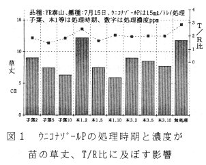 - 生育調節剤を処理することにより、草丈は制御できる。ウニコナゾールP 5ppm液の本葉1枚時期、トレイ当たり15ml処理の効果が高いが、状況に応じて濃度2~10ppmの範囲で、草丈を無処理の60%程度に抑制できる(図1)。