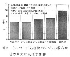また、ウニコナゾールPにより草丈が抑制されすぎた場合、定植の1週間前までにジベレリン(GA3 )50~100ppmを処理すると、草丈は約15%回復する(図2)。
