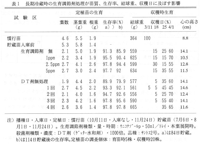 - 以上のことより、長期貯蔵法として育苗時のウニコナゾールP処理及び入庫前並びに貯蔵中のDT剤処理は有効で、84日間の貯蔵は可能である。