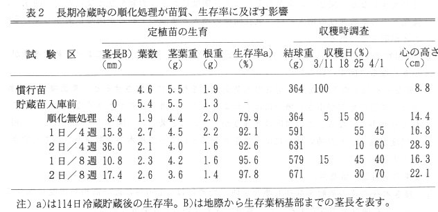 - 貯蔵期間中4週間毎の灌水時に順化処理(1~2日)を検討したところ、順化苗は徒長気味の苗となり、収穫時には抽苔球も多くなる。