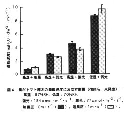 - 接ぎ木直後のトマト穂木の蒸散速度を小さくして苗の萎凋を防ぐためには、高い相対湿度を保ち、気孔開度を小さくするとともに、葉温の上昇を防ぐことが必要である。高相対湿度環境では、風は葉温の上昇を防いで蒸散速度を小さくする。その効果は光が強いほど大きい。