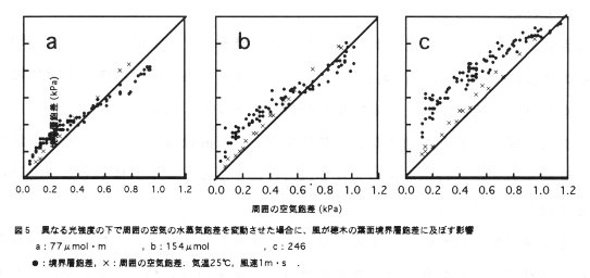 - 異なる光強度の下で周囲の空気の水蒸気飽差を徐々に変化させると、葉面境界層の飽差は、周囲の飽差が小さい場合にはこれより高く、周囲の飽差が大きくなると、逆にこれよりも小さくなる。この傾向は光強度が大きいほど著しい(図5)。このことは、相対湿度が高く、光が強い場合には、風を送ることによって穂木の蒸散速度を小さくできることを示している。