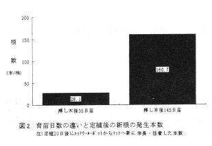 - 大苗(130日間7.5×5.0×5.0cmロックウールポットで育苗)と通常苗(35日育苗)をロックウールマットに定植し、定植20後ロックウールポット底面からマットへの新根の発生本数を比較したところ、大苗160.7本に対して、通常苗28.1本となった(図2)。大苗は通常苗に比べて非常に旺盛な活着力を示す。