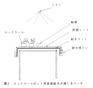 - 大苗の育苗は図3に示すような底面吸水式ベンチで省力的に育苗できる。また、栽培温室が連棟の場合は谷間に、畦波板とミカンのコンテナ等で作成した簡易なものを設置すると低コストですむ。