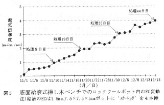 - 水道水で飽水した7.5×5.0×5.0cmロックウールポットにさし木し、その直後から吸水マットに園試処方でEC1.5ms/cm/secの養液を5リットル/日/㎡を1日5回に分けて与えるとロックウール内のECは、徐々に上昇する(図5)。