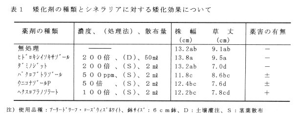 - ヒドロキシイソキサゾール剤での処理区を除き、各種薬剤処理により草丈、株幅ともに抑制された。また、ダミノジット剤処理区では薬害もなく質的に優れていた。(表1)