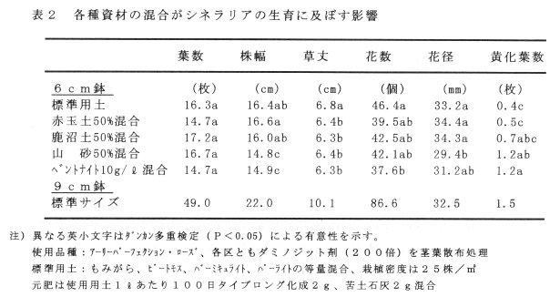 - シネラリアを6㎝鉢に小型化するには、ダミノジット剤の200倍茎葉散布処理が薬害の発生もなく有効である。また、用土への赤玉土または鹿沼土の混合とベントナイトの混入により草丈等を抑制することが可能である。