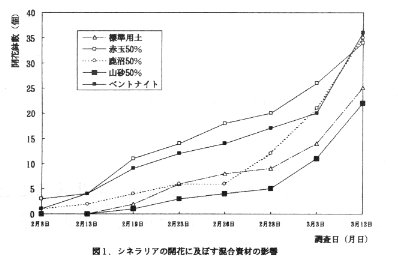 - 山砂50%混合区を除き、いずれの区においても標準用土区より開花期が早まる傾向が見られた。(図1)