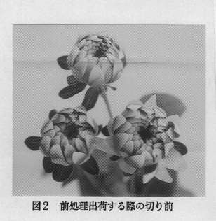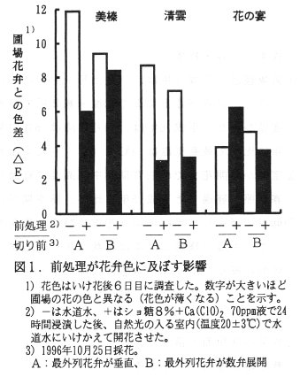 - 切り花をショ糖8%+Ca(ClO)2 70ppm 液に24時間浸漬処理し出荷すると、中央花弁の展開が促されると同時に花弁の色が鮮やかになり、花色を圃場で自然に開花した状態に近づけることができる(表1)。